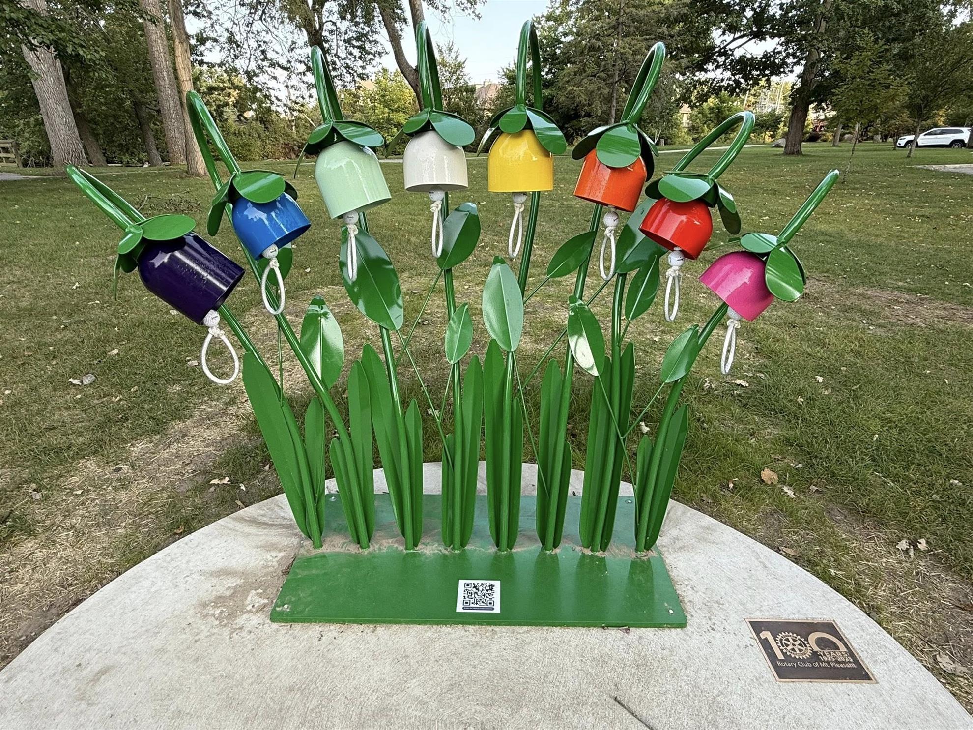 The Rotary Club of Mt. Pleasant has installed a KinderBells music sculpture at Nelson Park as a centennial signature project. The project encompasses multiple focuses of Rotary, including the environment, literacy, mental health, and the tradition of music in Rotary meetings. The sculpture is made of repurposed oxygen tanks and was created by Traverse City-based artist, Tom Kaufmann.