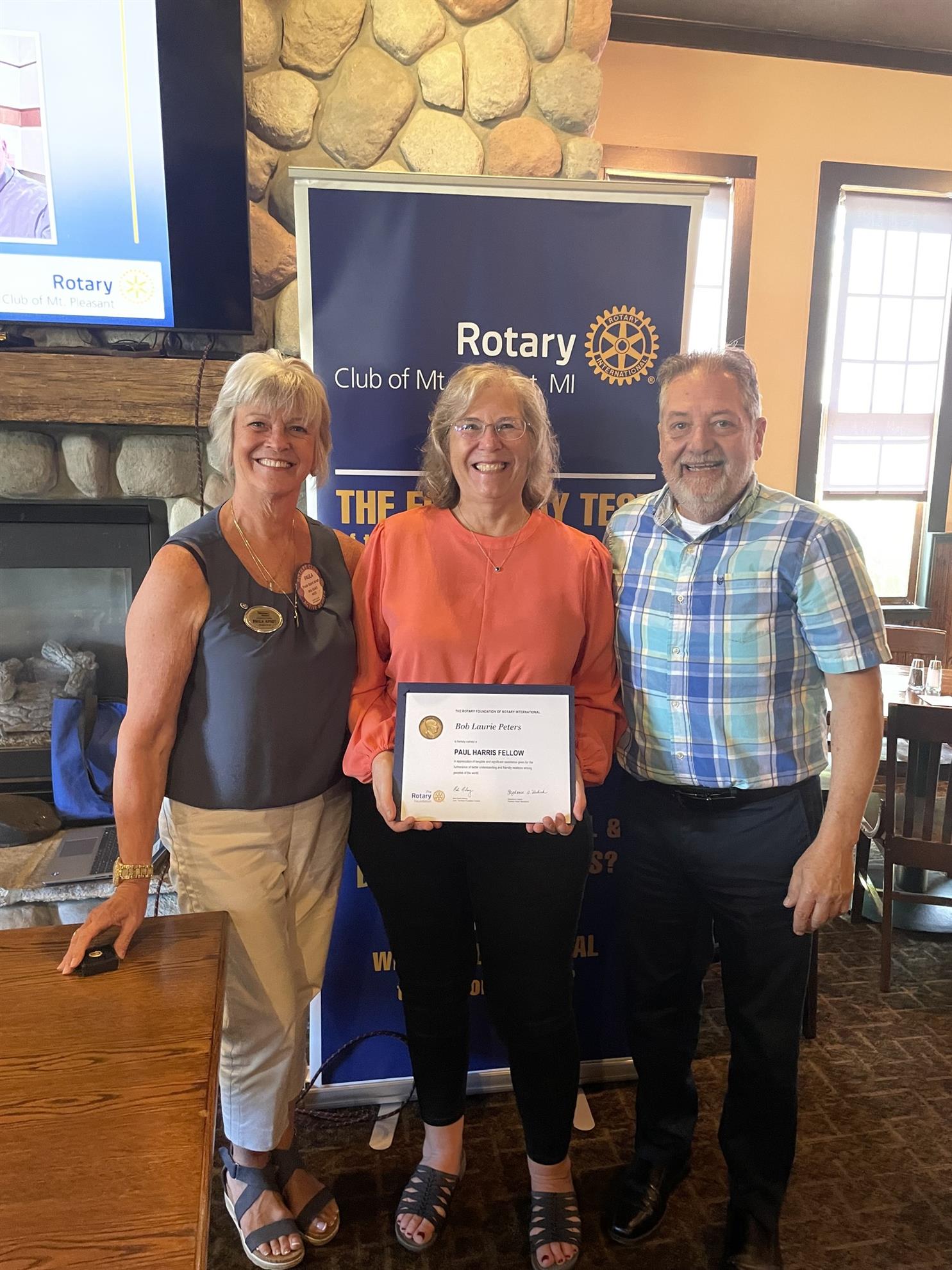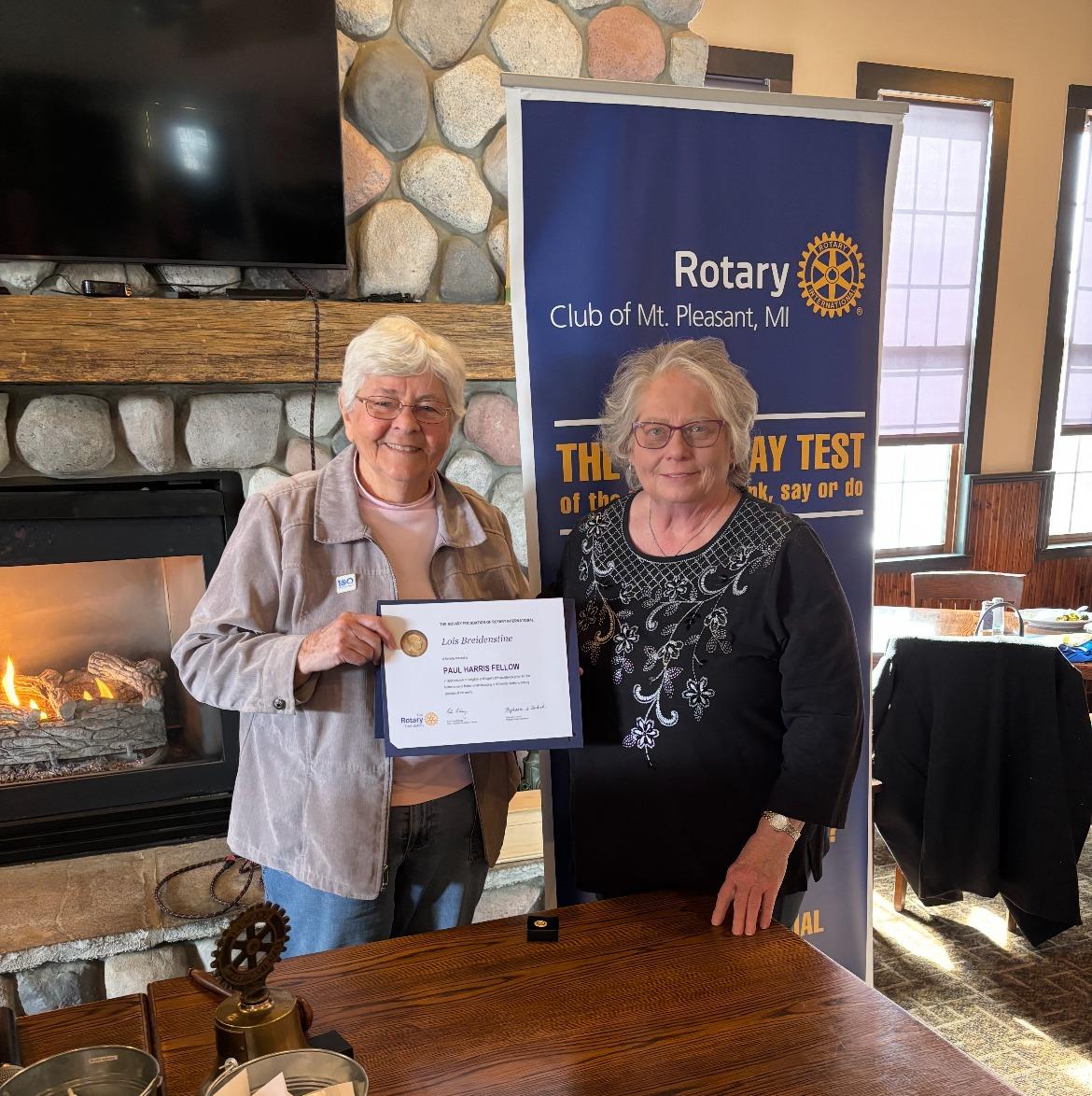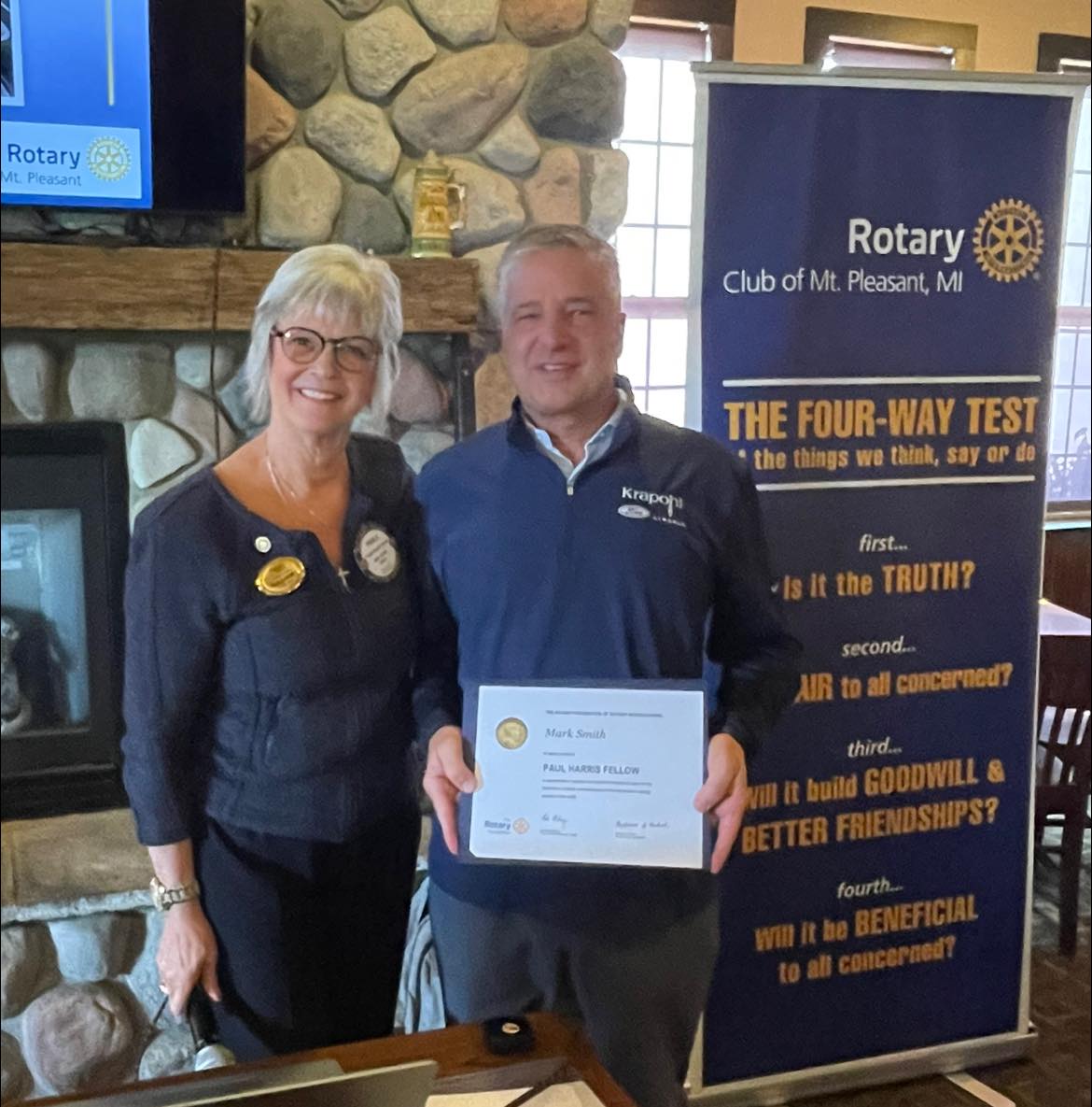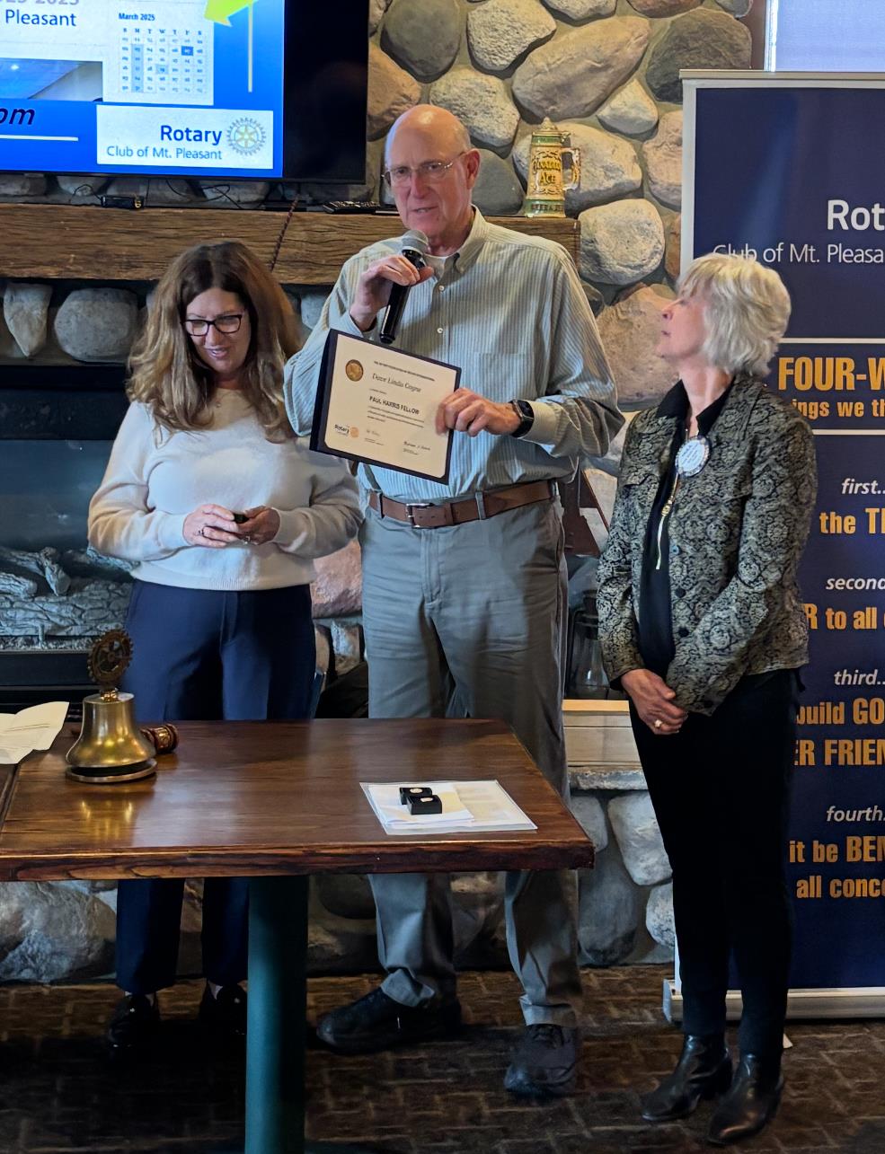 Named after Paul Harris, a Chicago attorney and Rotary founder, the honorary Paul Harris Fellow Award is presented to individuals who have a contribution of $1,000 or more made to The Rotary Foundation in their name. Designed to recognize and appreciate citizens who have made a significant impact on their community, individuals selected by the Rotary Club of Mt. Pleasant are honored for their meaningful contributions and are described as having enhanced the quality of life in the area.